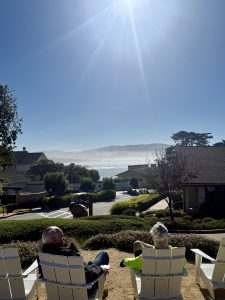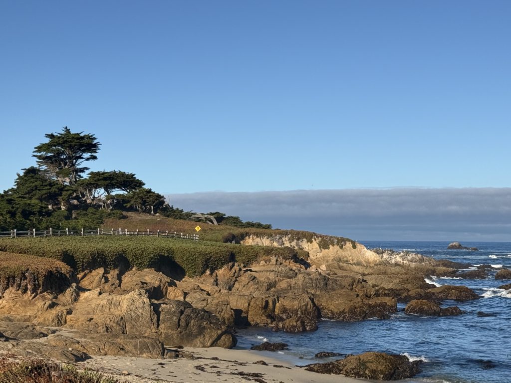 Across the street, the boardwalk create a path to a nature preserve, with a couple perfectly placed park benches to watch the ocean and listen to waves. This is probably my favorite individual spot in Pebble Beach. Also you’ll see a colorful storybook house at the top of the hill that looks right out of a Grimm’s tale.