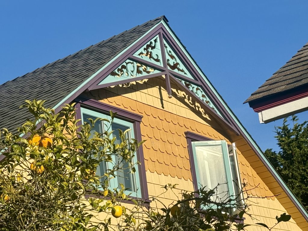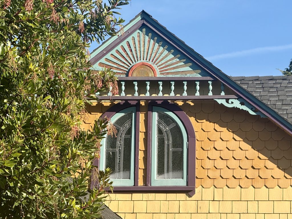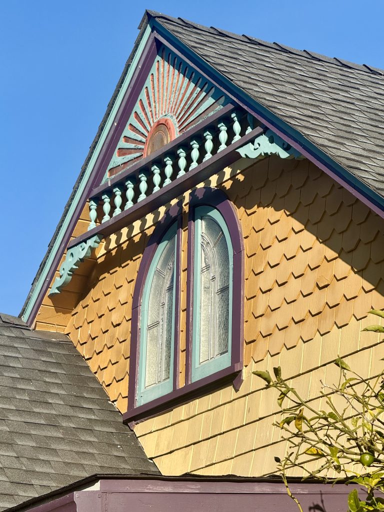 2. It’s not just the sunburst; the cross-gabled roofs provides more canvas for bright, colorful asymmetric features and the home deliver on every face; for example, here is the right side’s teal gable face with scroll-sawn fretwork, fish-scale shingles and rake molding.