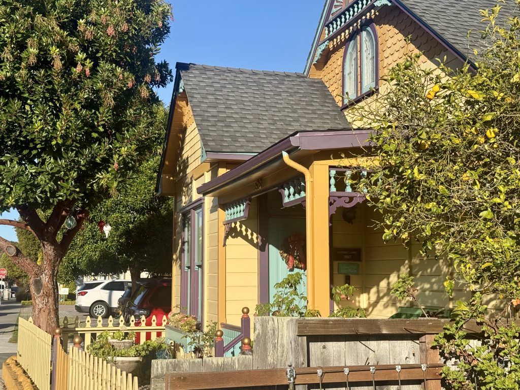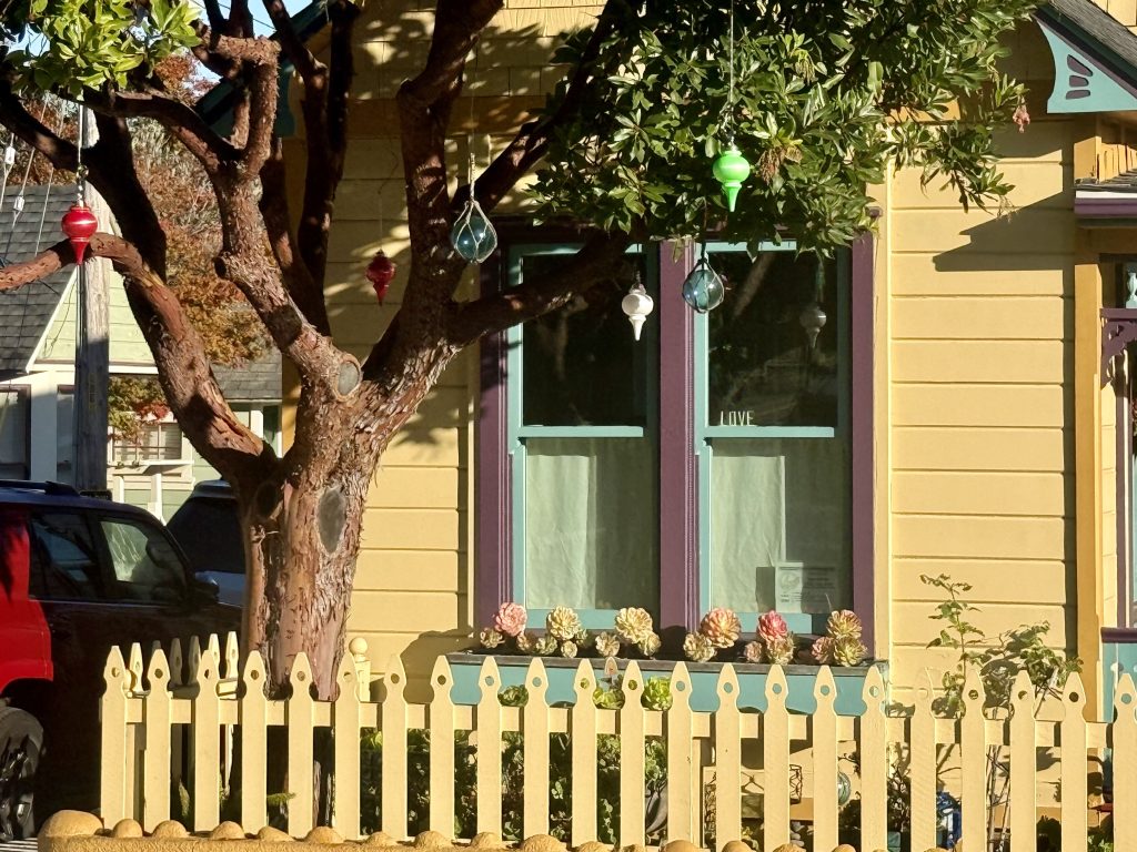 The trim provides teal and purple contrast and the variety of bright colors just makes the house more fun. The colors soften the elaborate ornamentation, as does the homeowner’s yard and porch decorations.