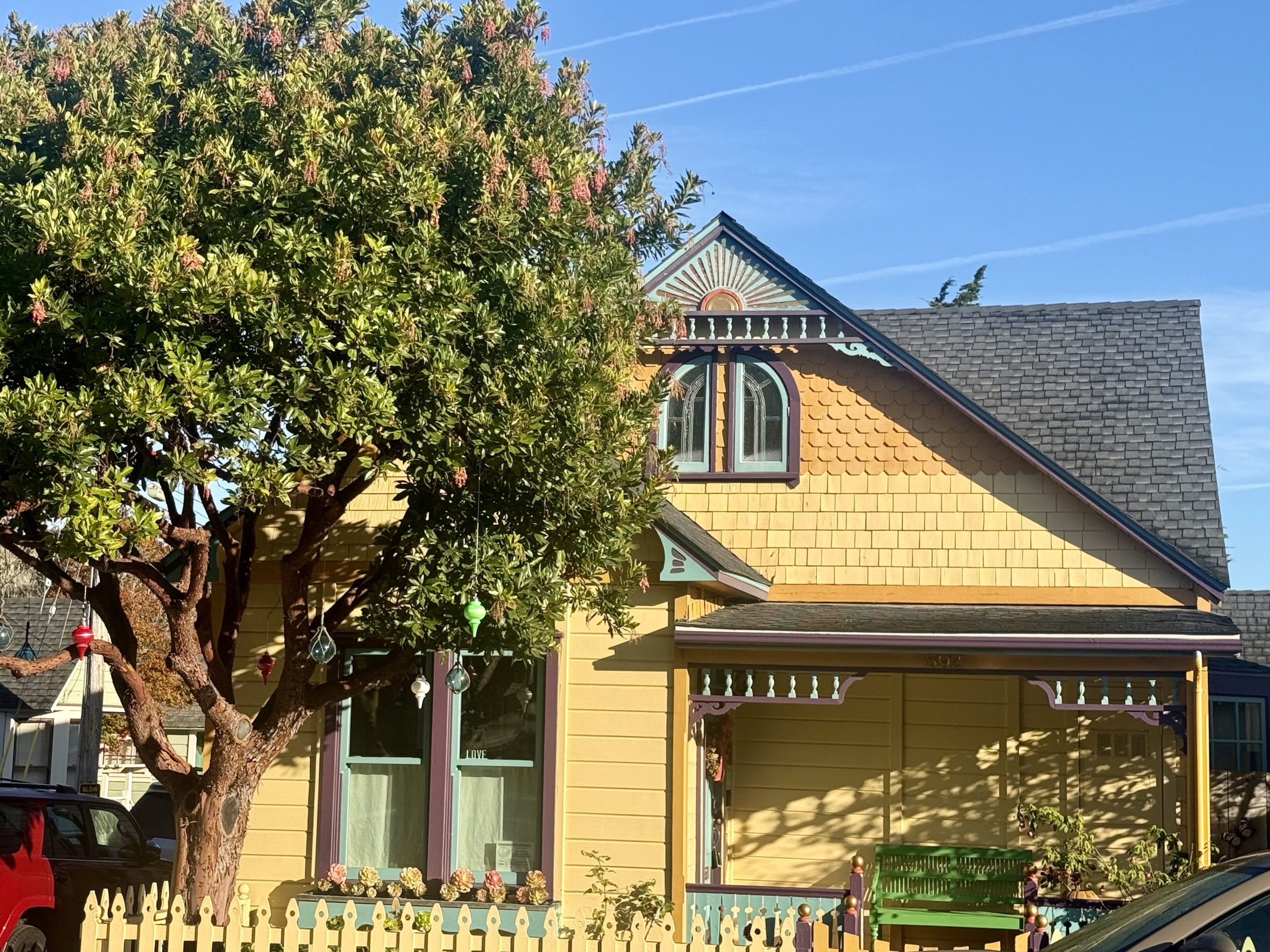 3. The color scheme and the variety of colors really sets this house apart from its neighbors. PG Victorians frequently have a main color with two contrasting trim colors, frequently one neutral color. This home uses much more color to liven things up: yellow (house and fence), gold (shingles and the inner sunburst), teal (door, trim, porch) purple (door, trim and railing) and orange (the sunburst), including both yellow/purple and teal blue/orange contrasts.