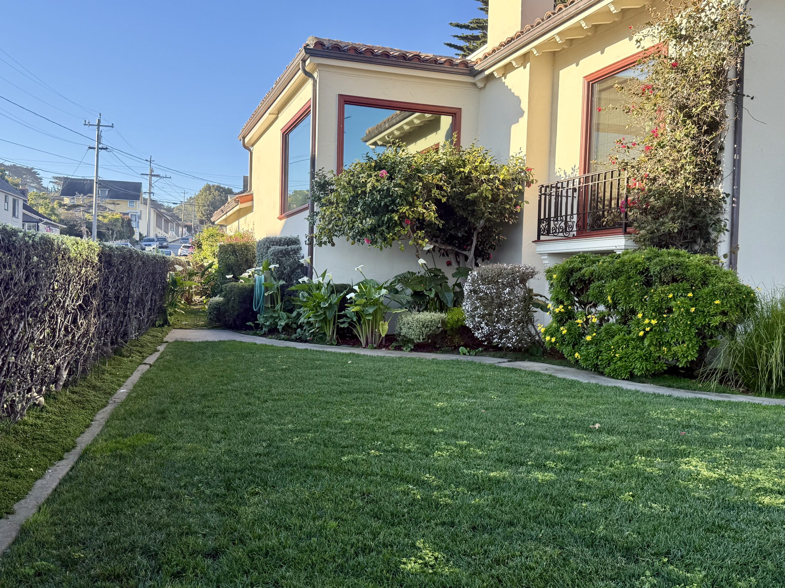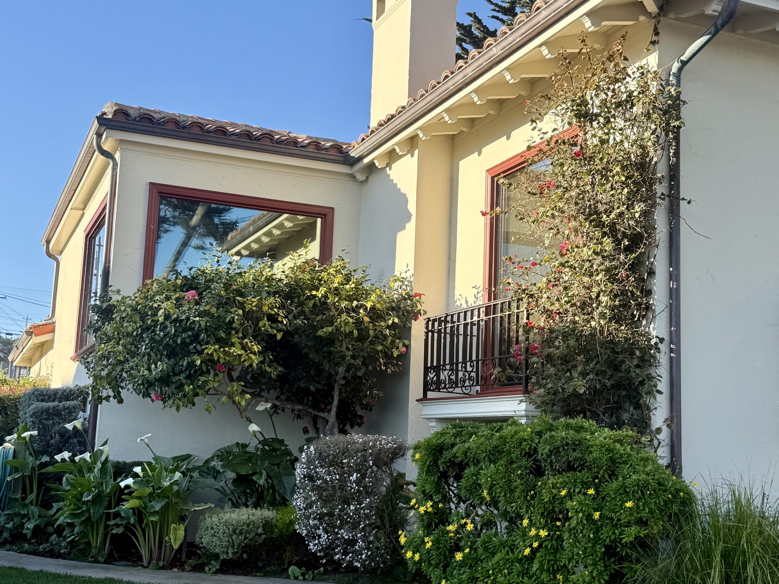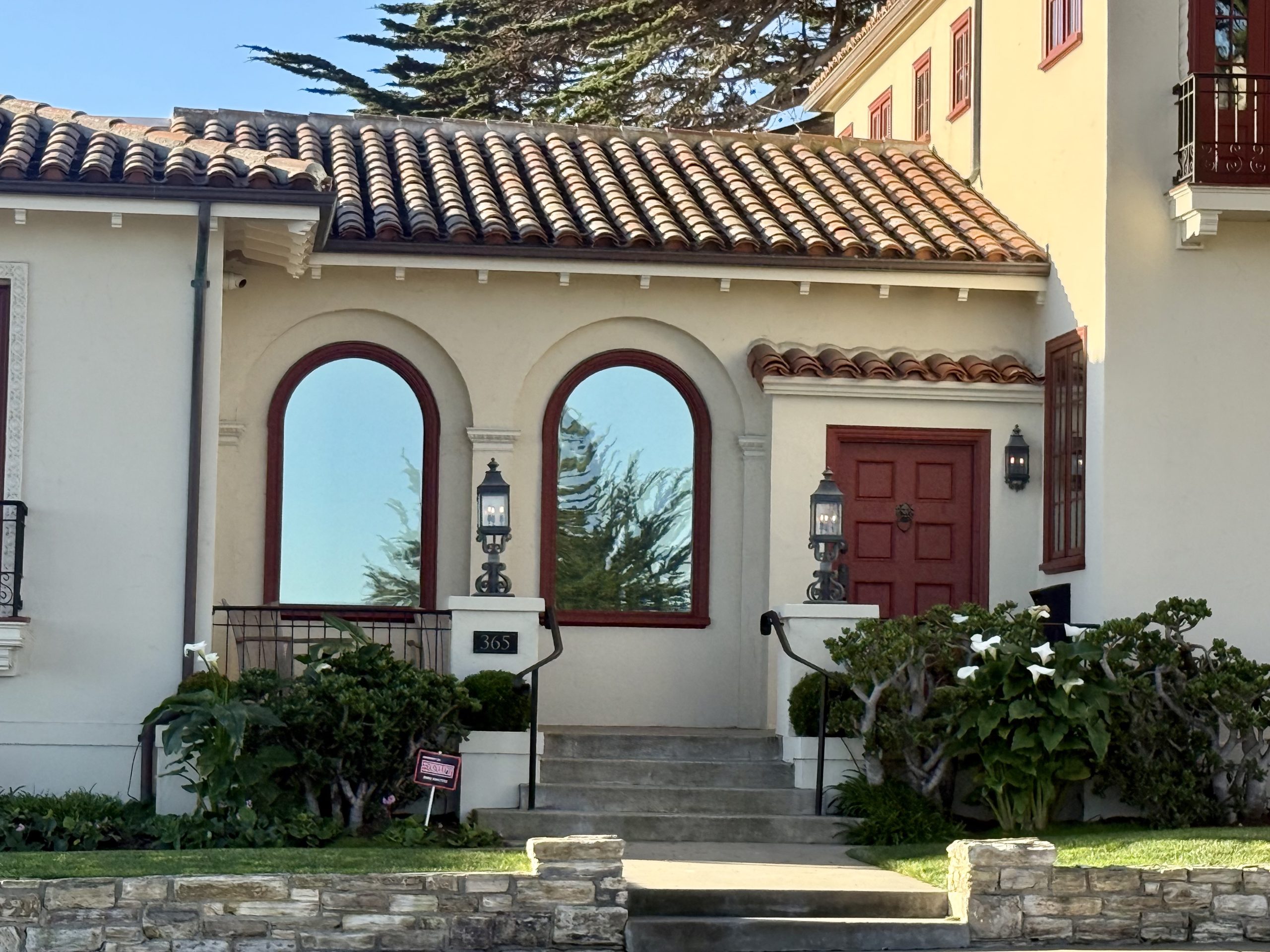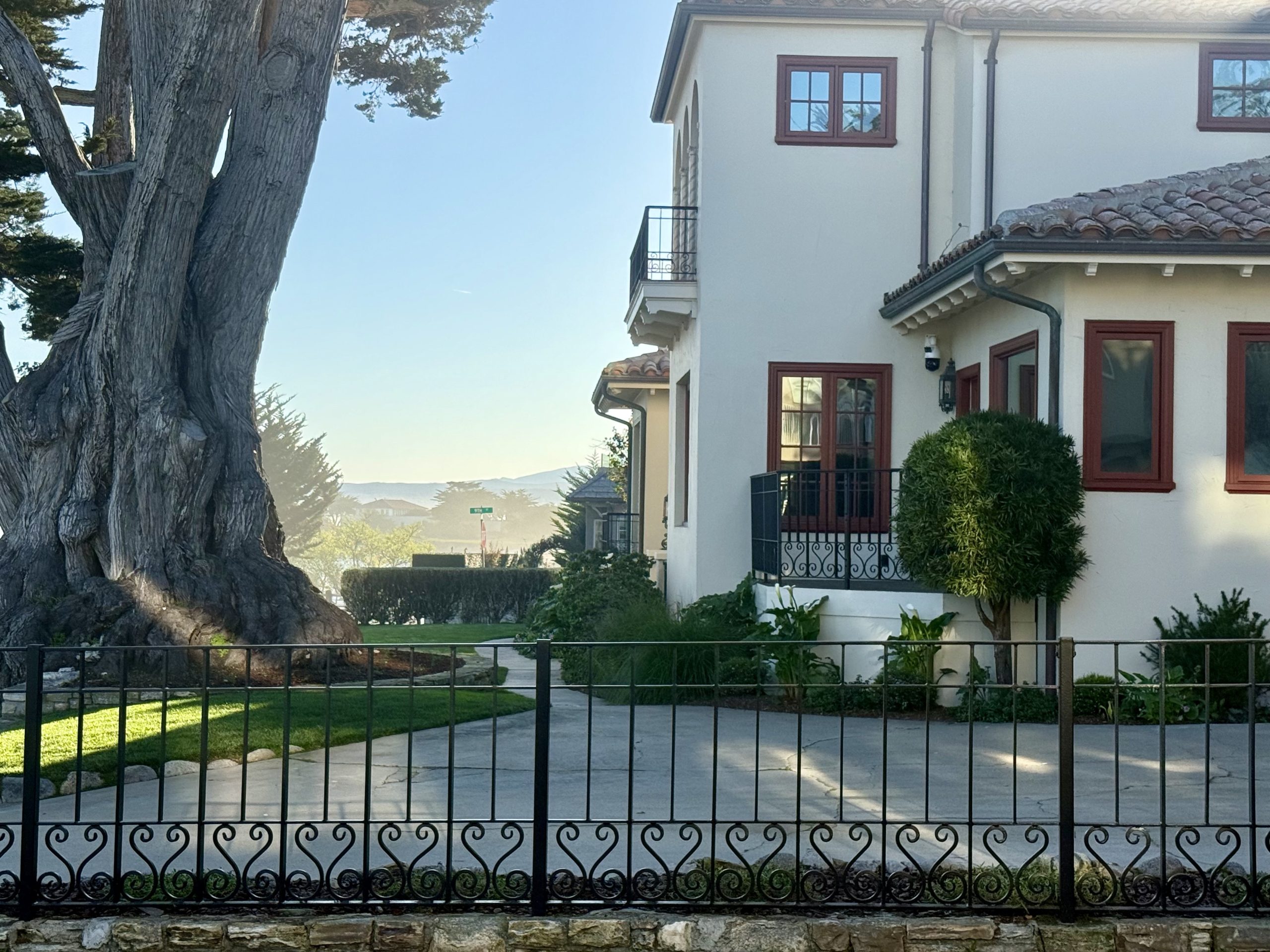 Built under a massive Cypress tree, this Spanish Colonial villa covers an entire oceanfront block and faces Berwick Park, the rec trail and Monterey Bay.
