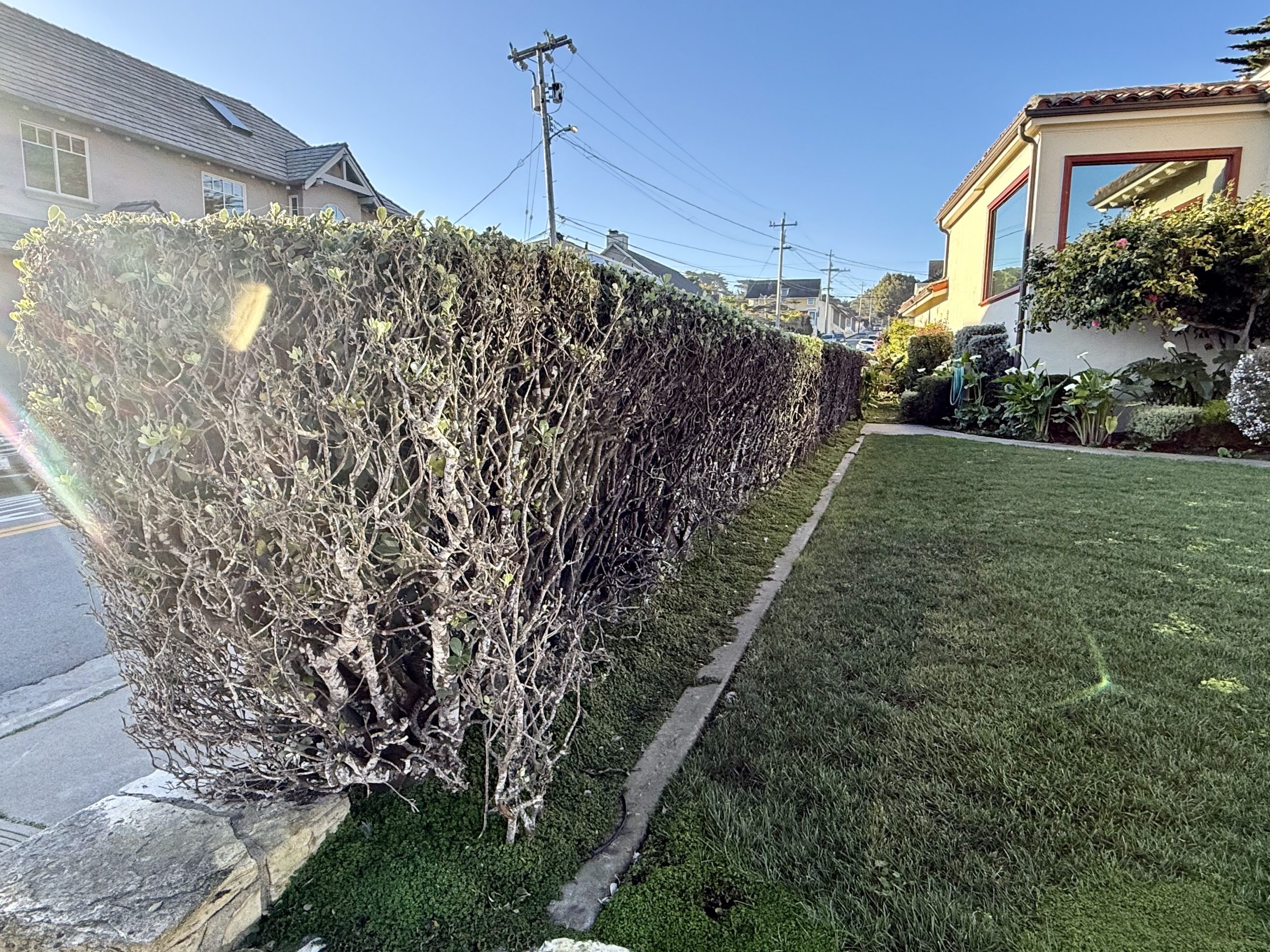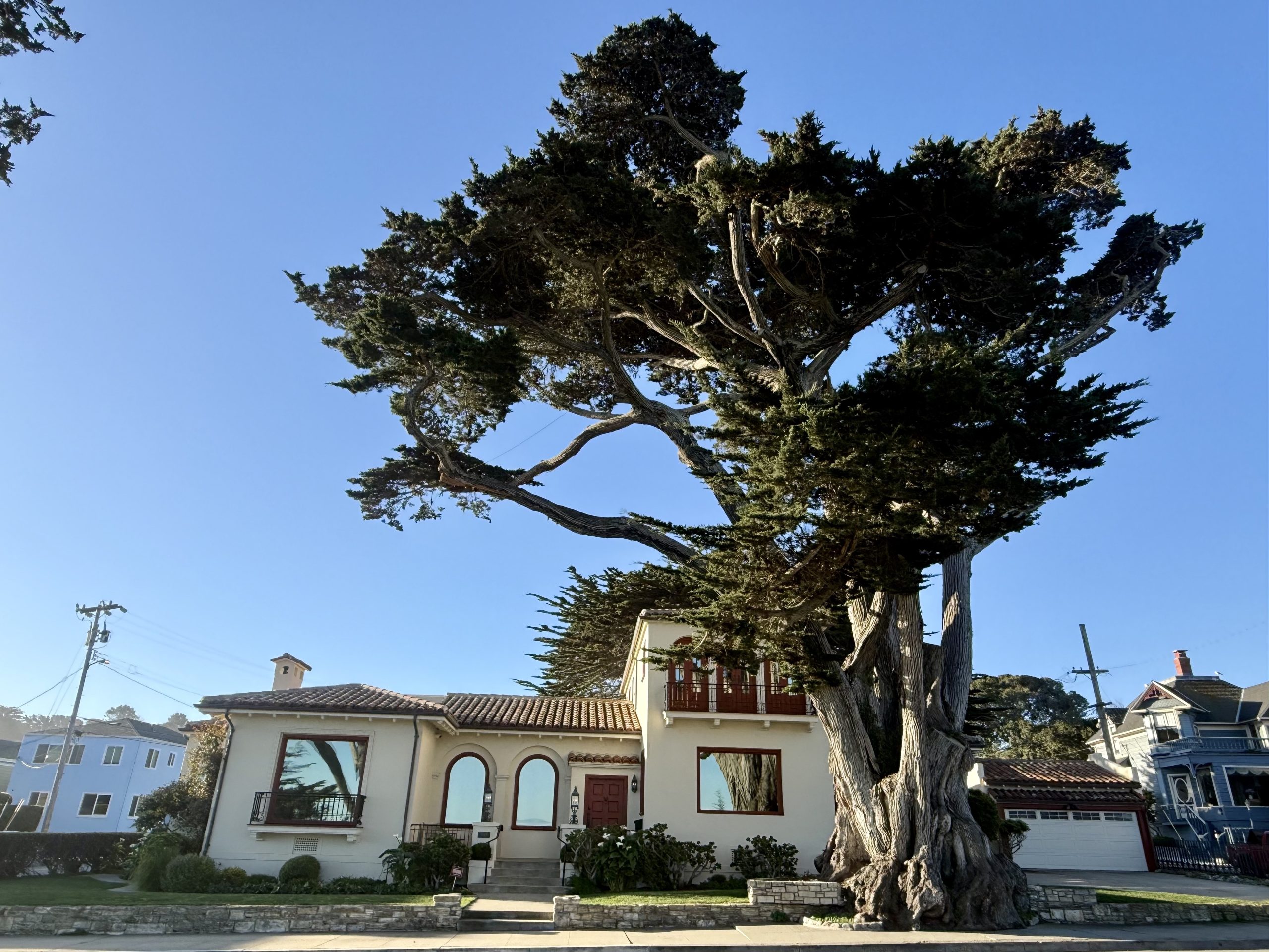 1. The giant Monterey cypress at the corner frames the façade and grounds the home in the landscape: