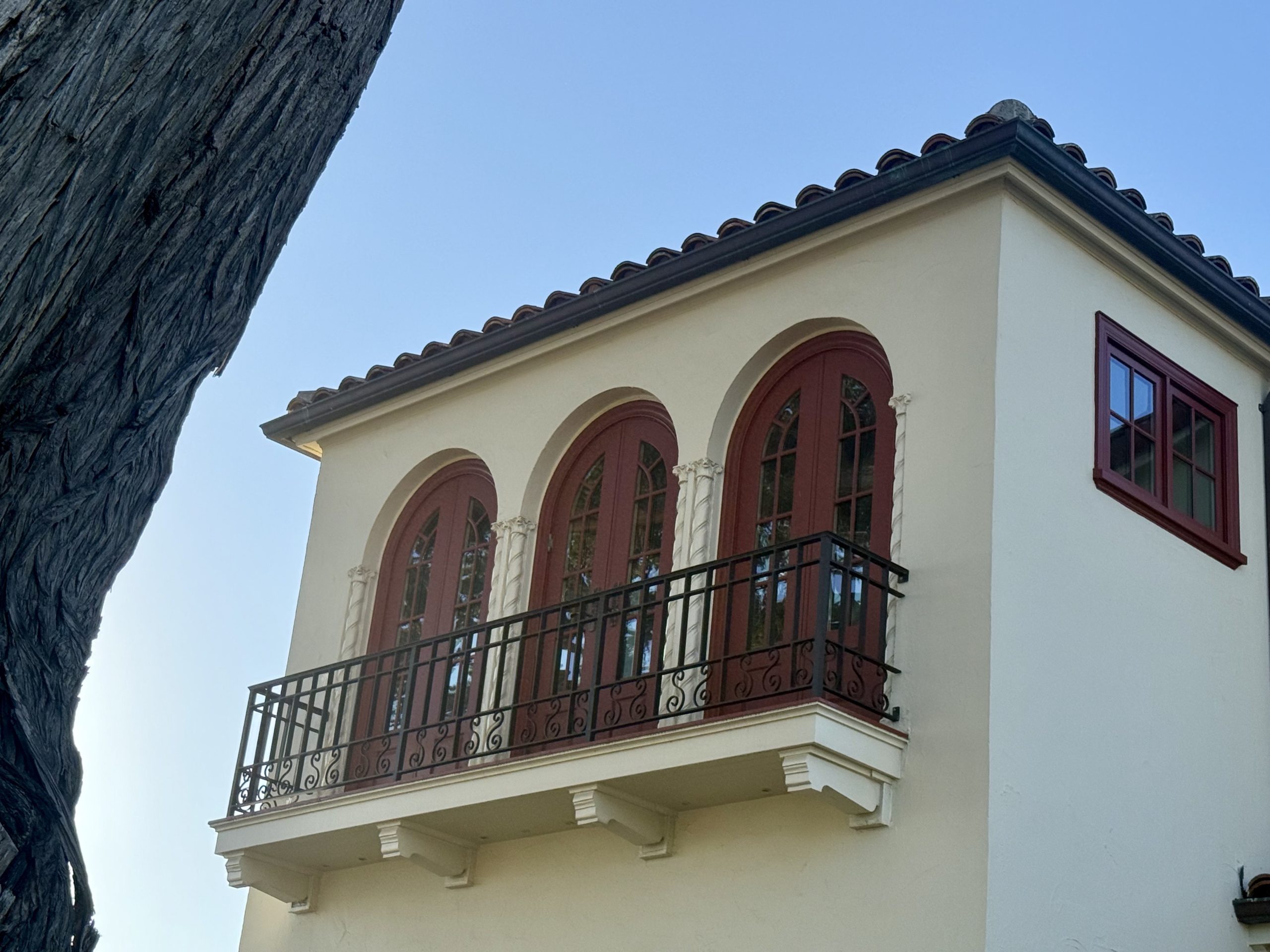 2. The arched triplet of doors at the second‑story balcony are really elegant, evoking a Mediterranean loggia.
