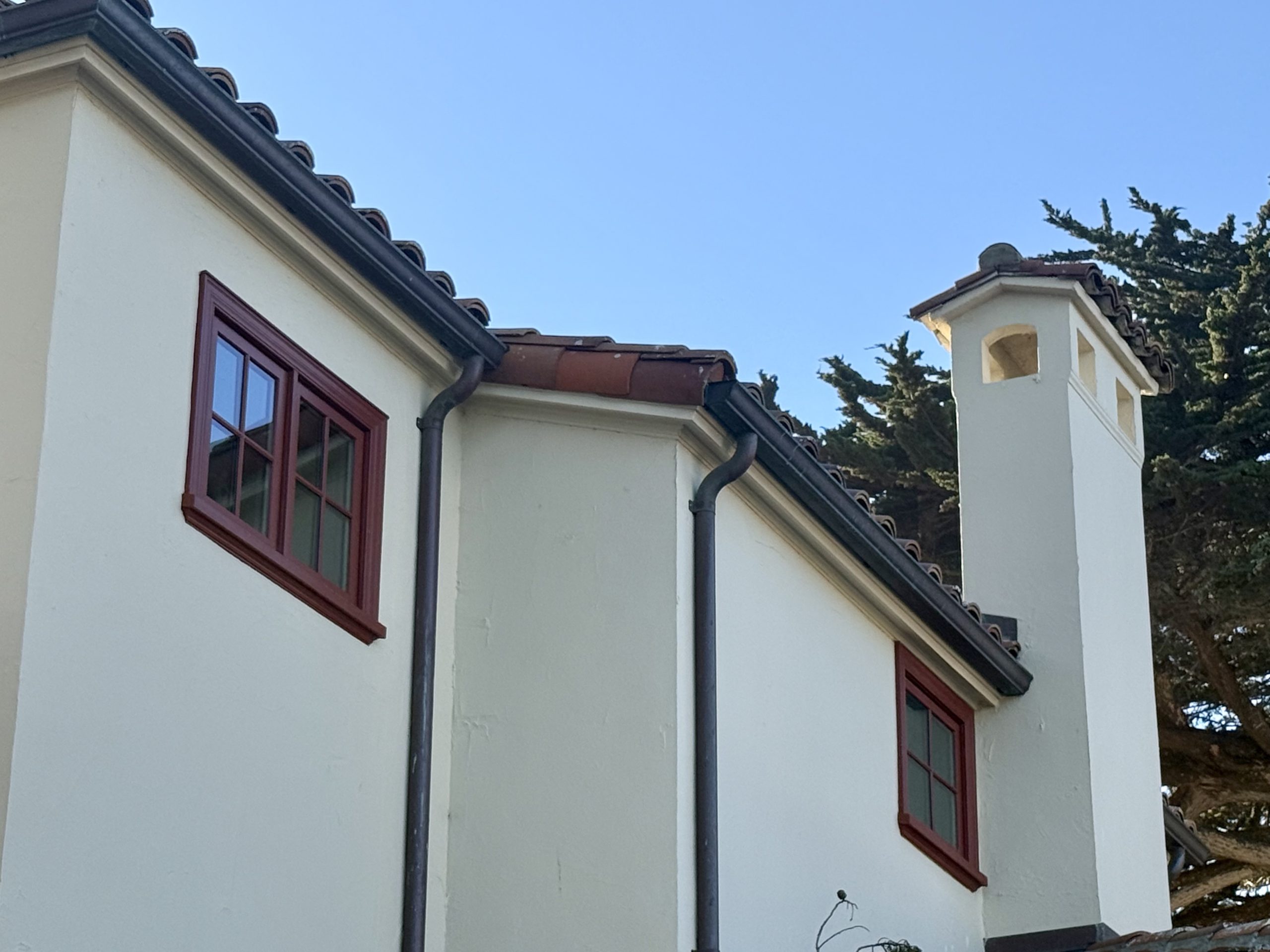 The home boasts textbook coastal Spanish Colonial Revival features like red barrel‑tile roof, smooth stucco, and deep wood windows. Picture windows and a stunning second-floor balcony showcase direct oceanfront views.