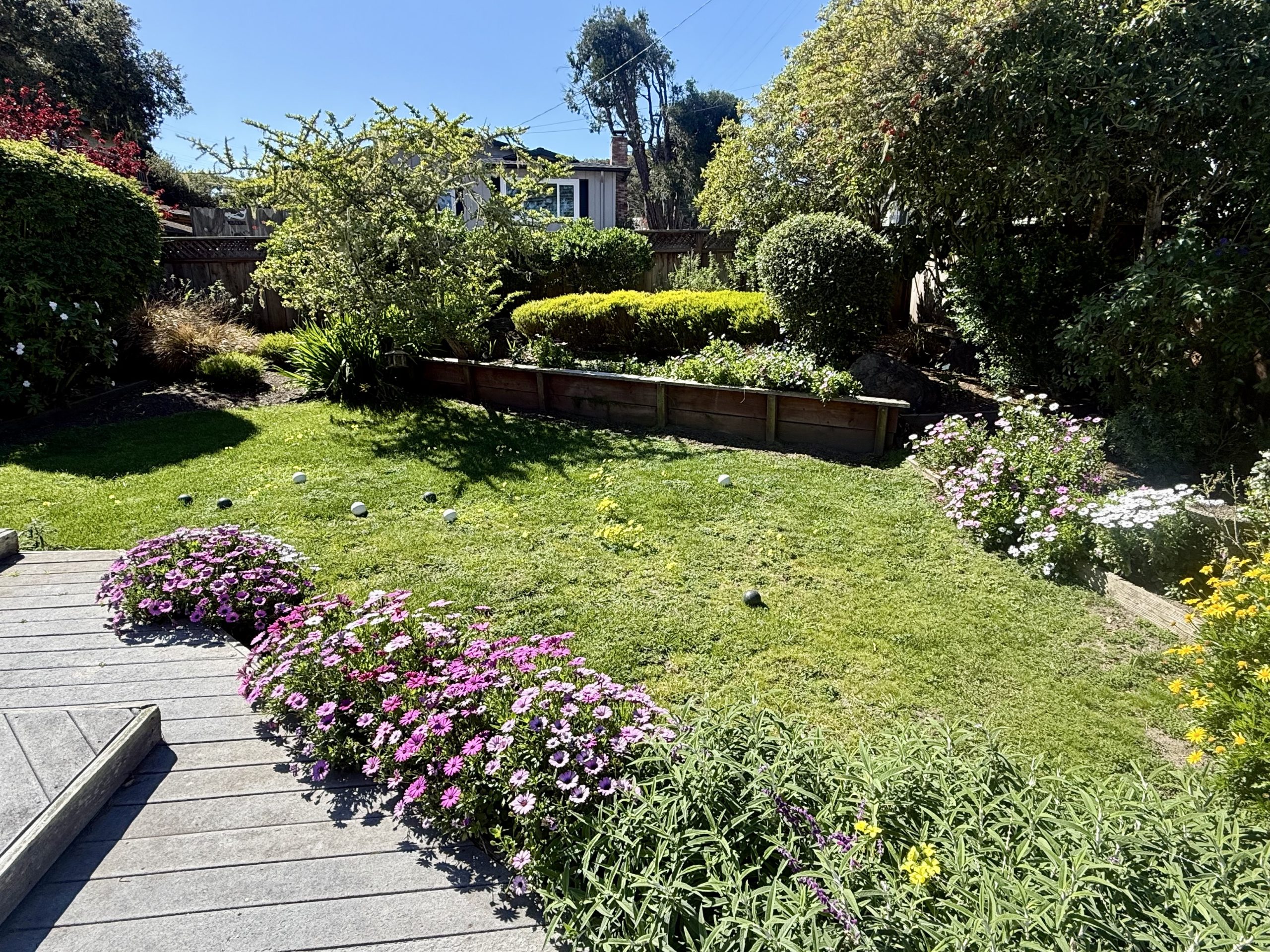 In the walled rear, the yard includes multiple staging areas, with a patio for entertaining and another garden to enjoy.