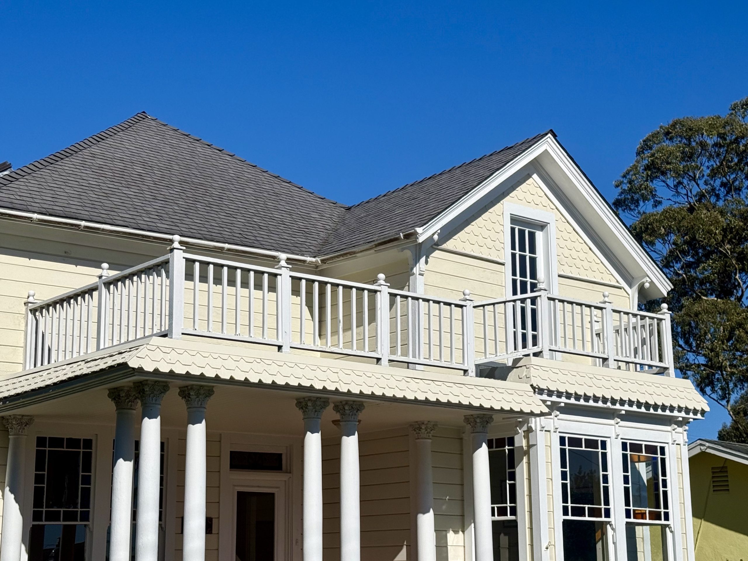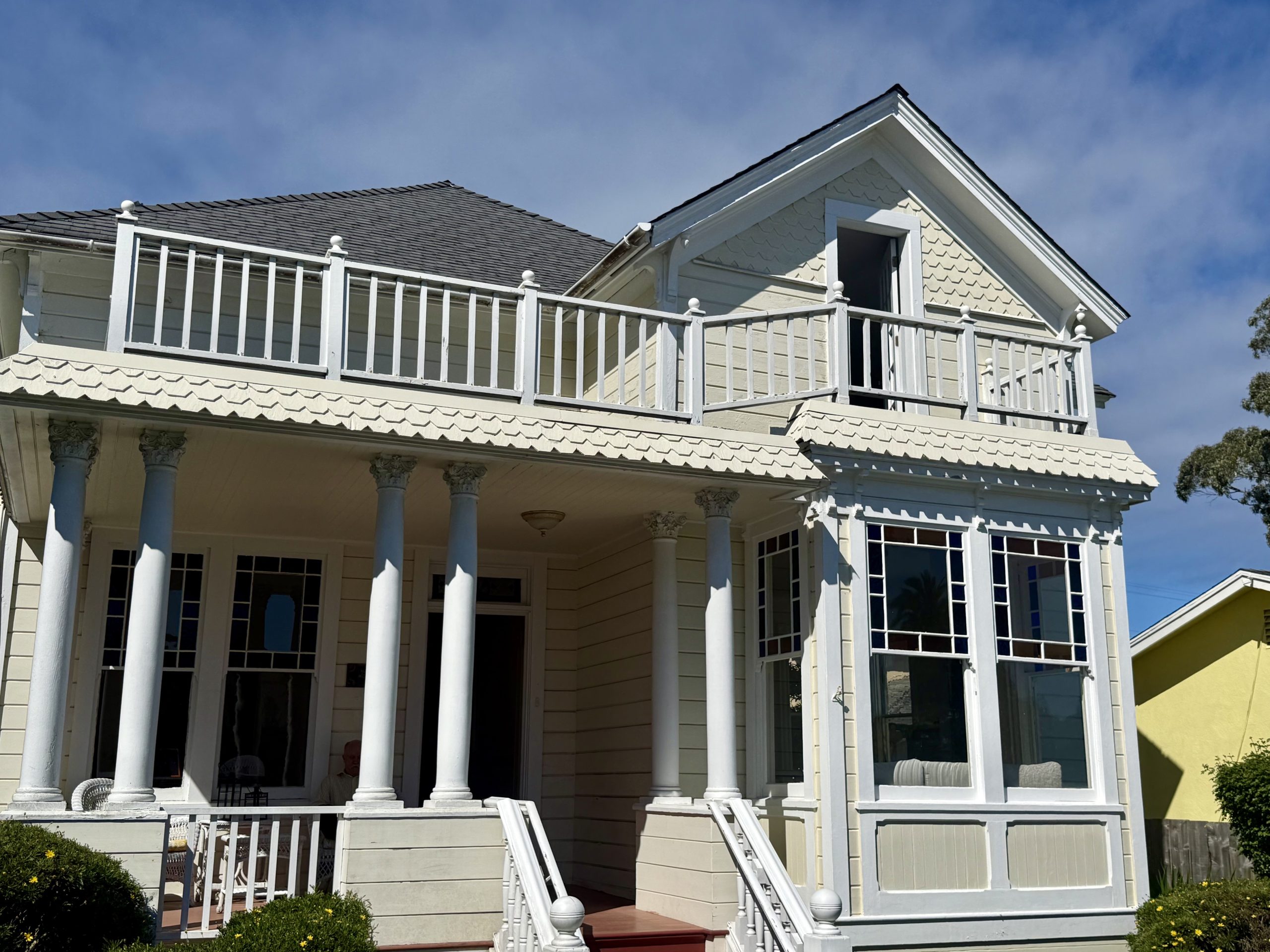 The unified color scheme (not to mention the the classical columns and the porch and balcony guardrails) gives the home a stately Colonial feel.