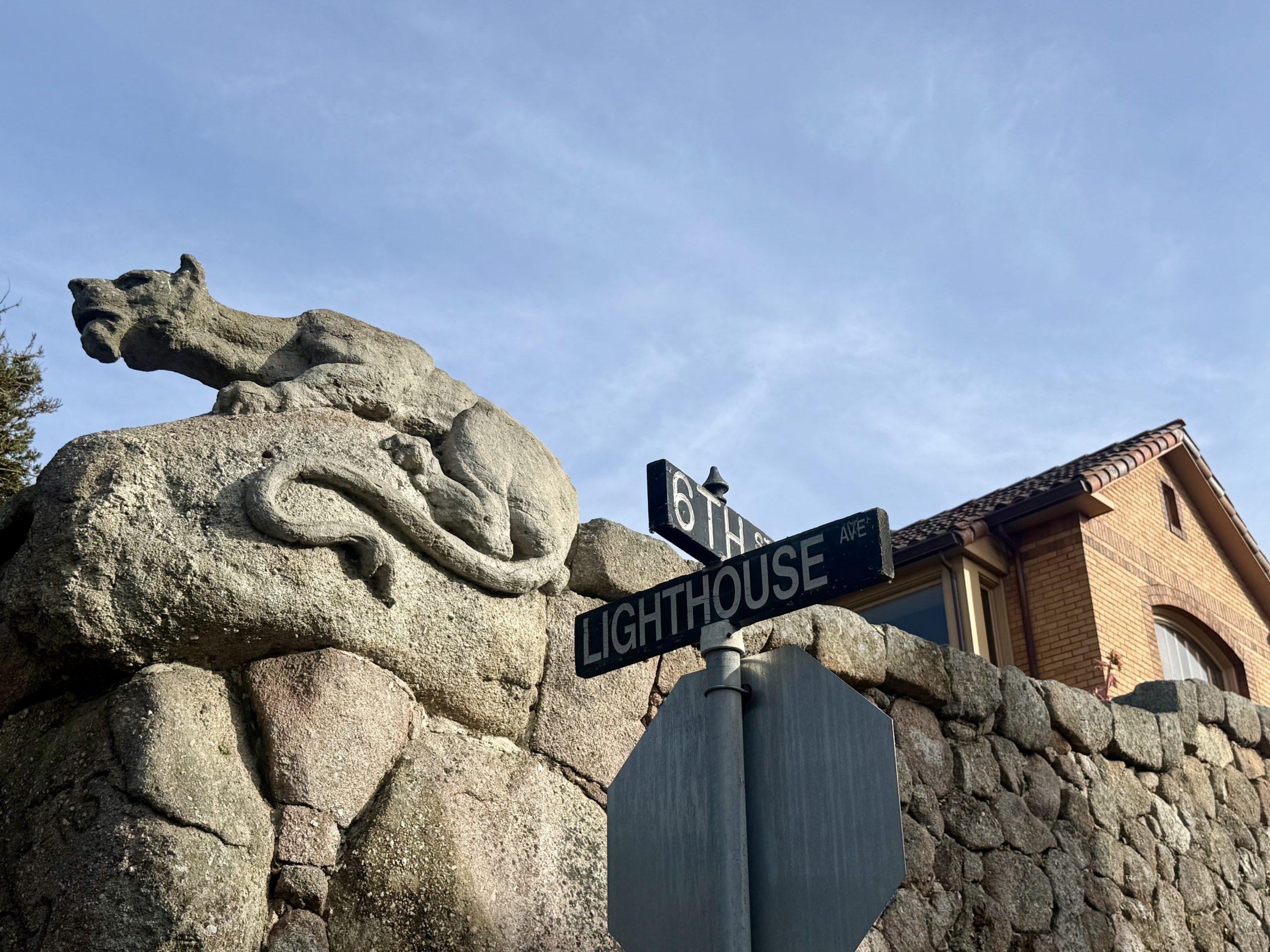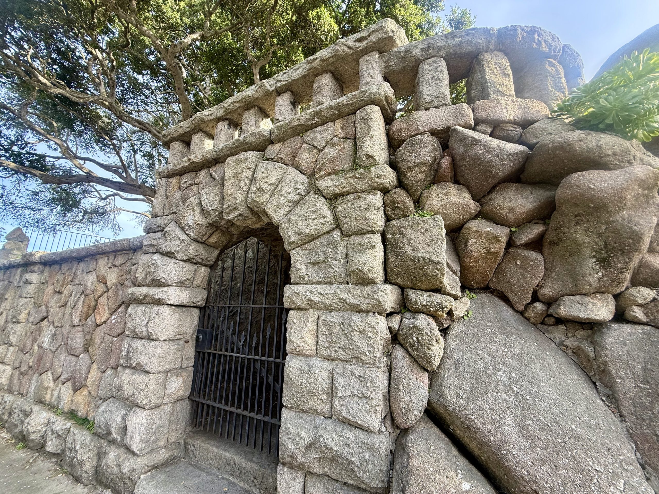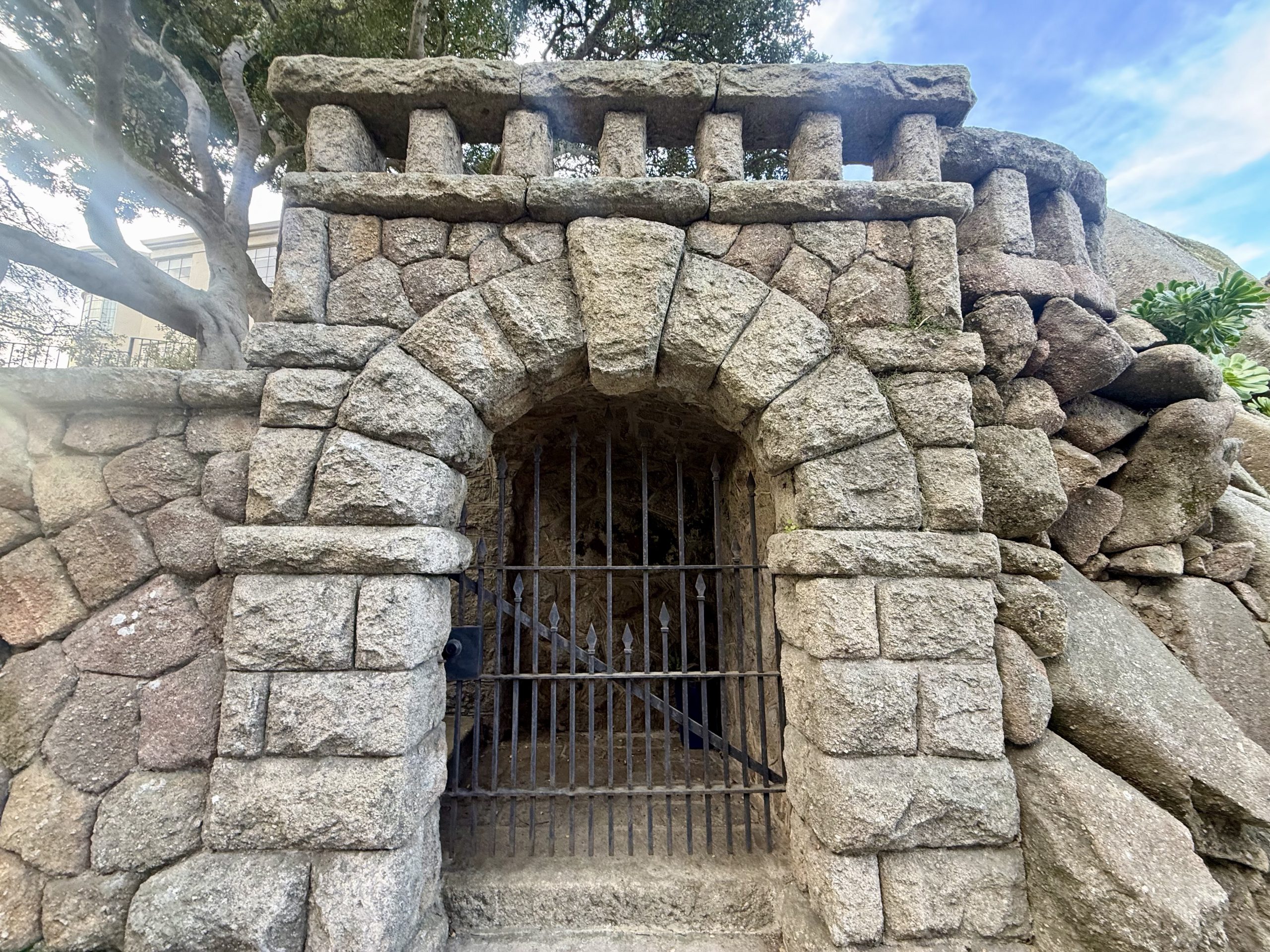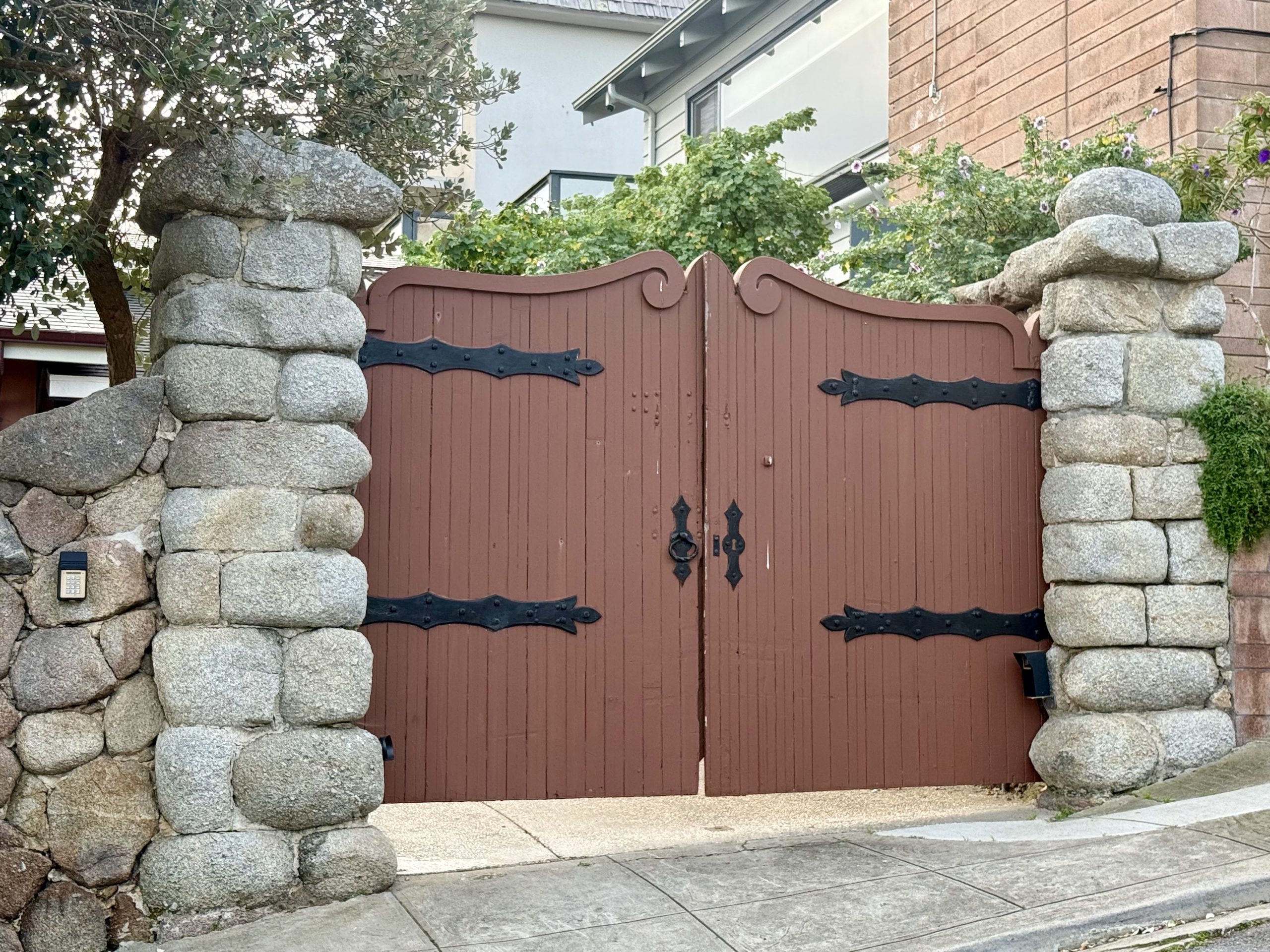 Outside its gate, “The Boulders” is enclosed by a massive medieval stone wall. the huge wooden gates reinforced with ironwork and “guarded” by a sculpted cement mountain lion that predates the home.