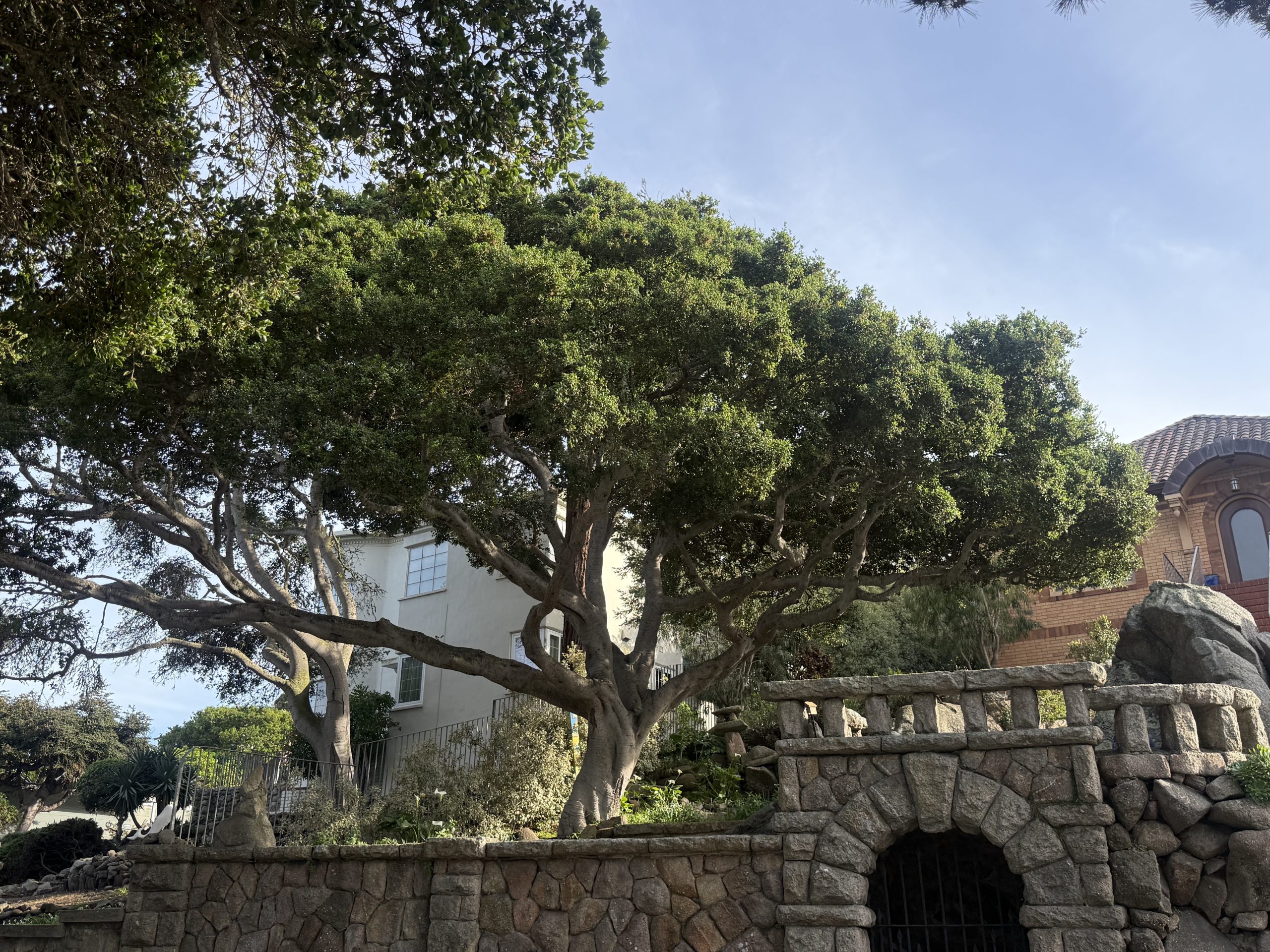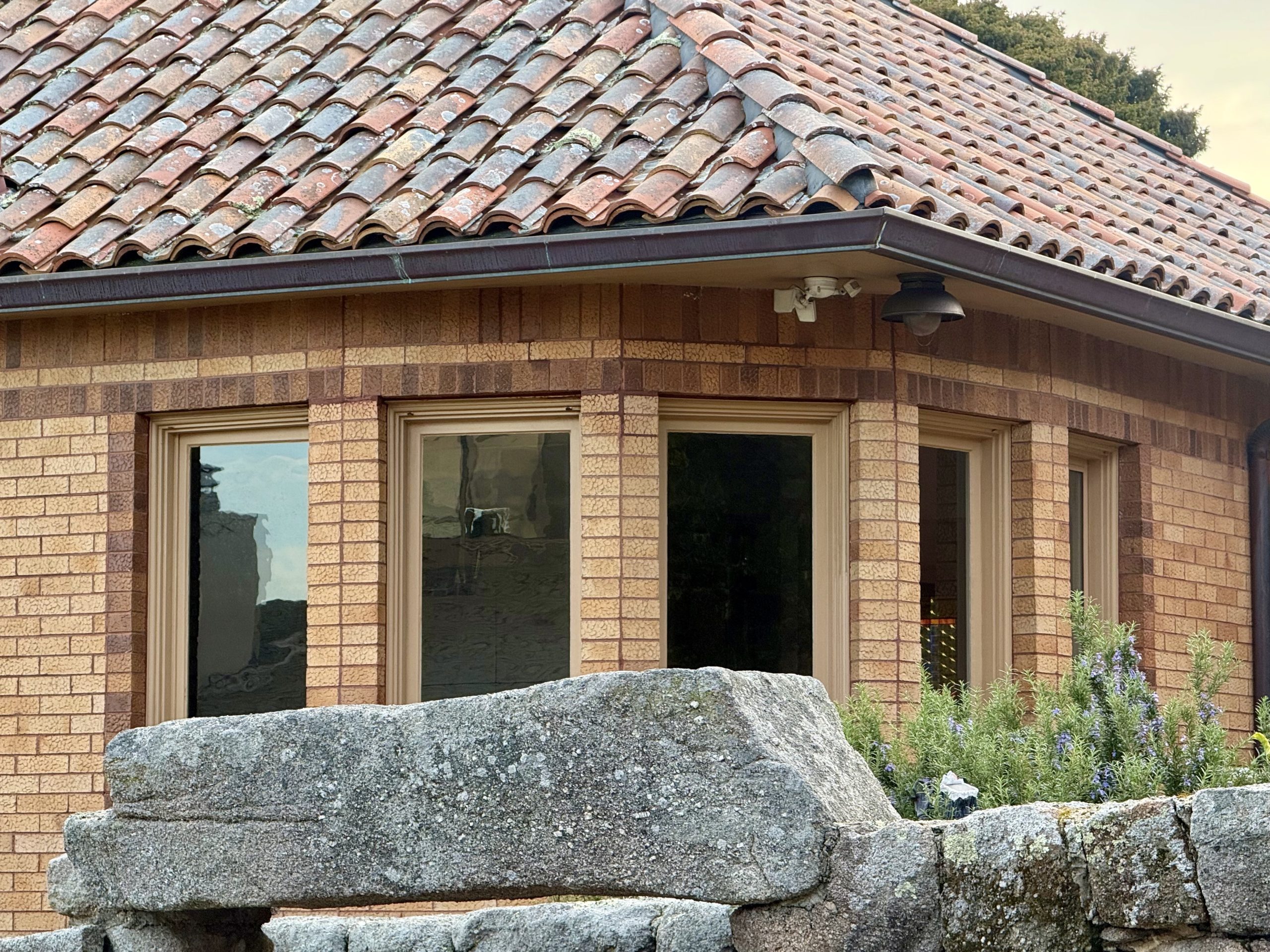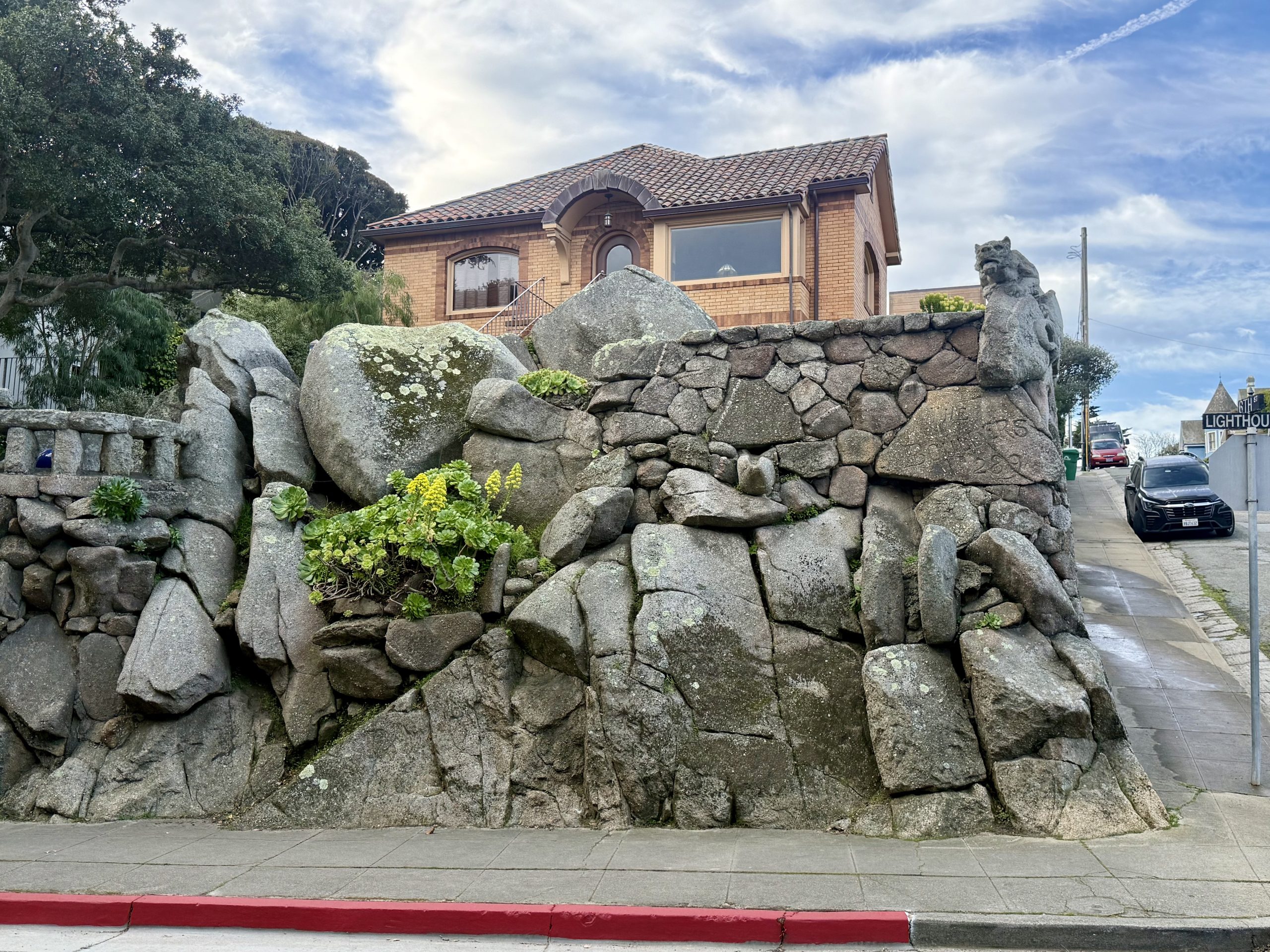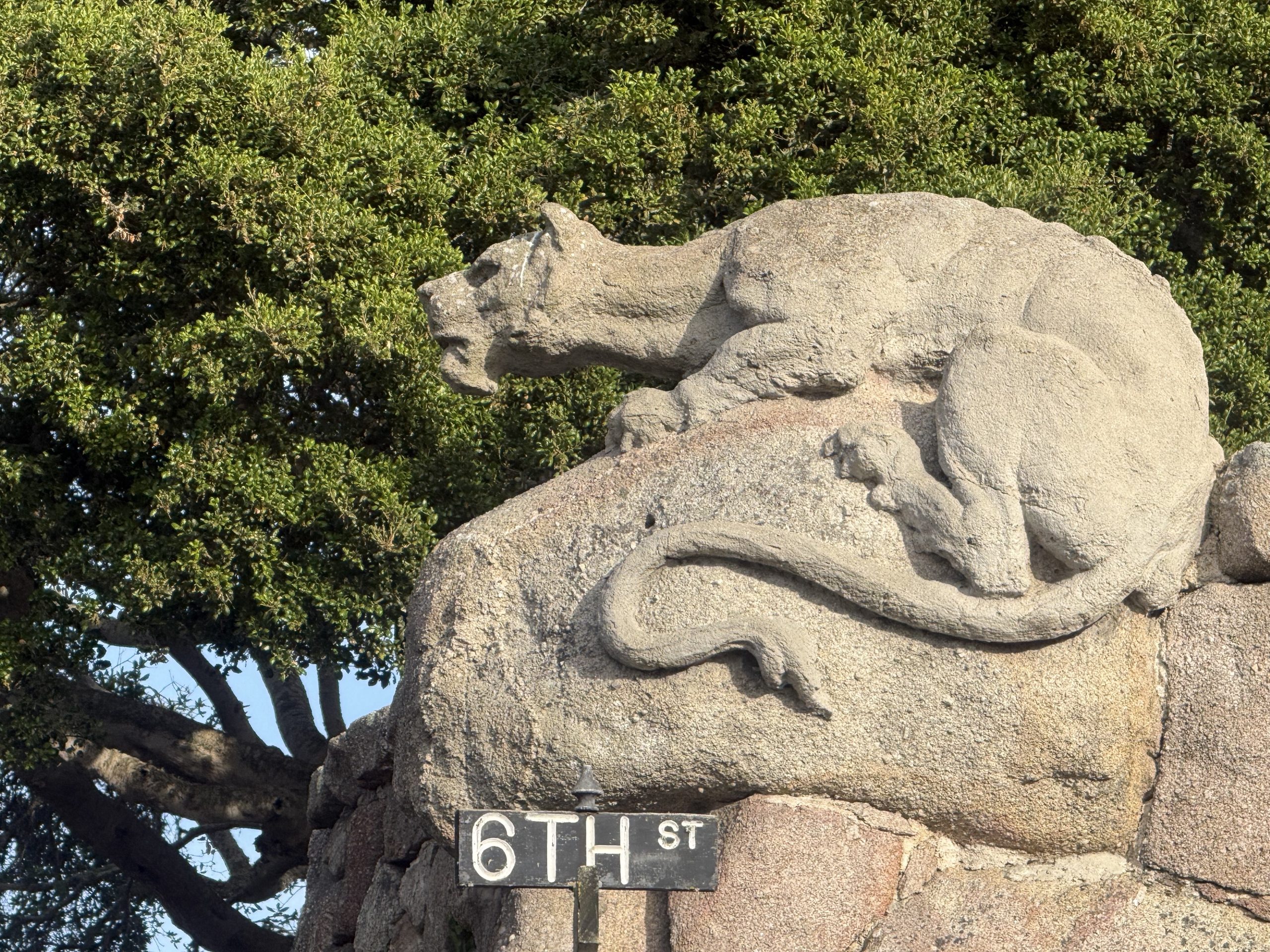 Outside its gate, “The Boulders” is enclosed by a massive medieval stone wall. the huge wooden gates reinforced with ironwork and “guarded” by a sculpted cement mountain lion that predates the home.