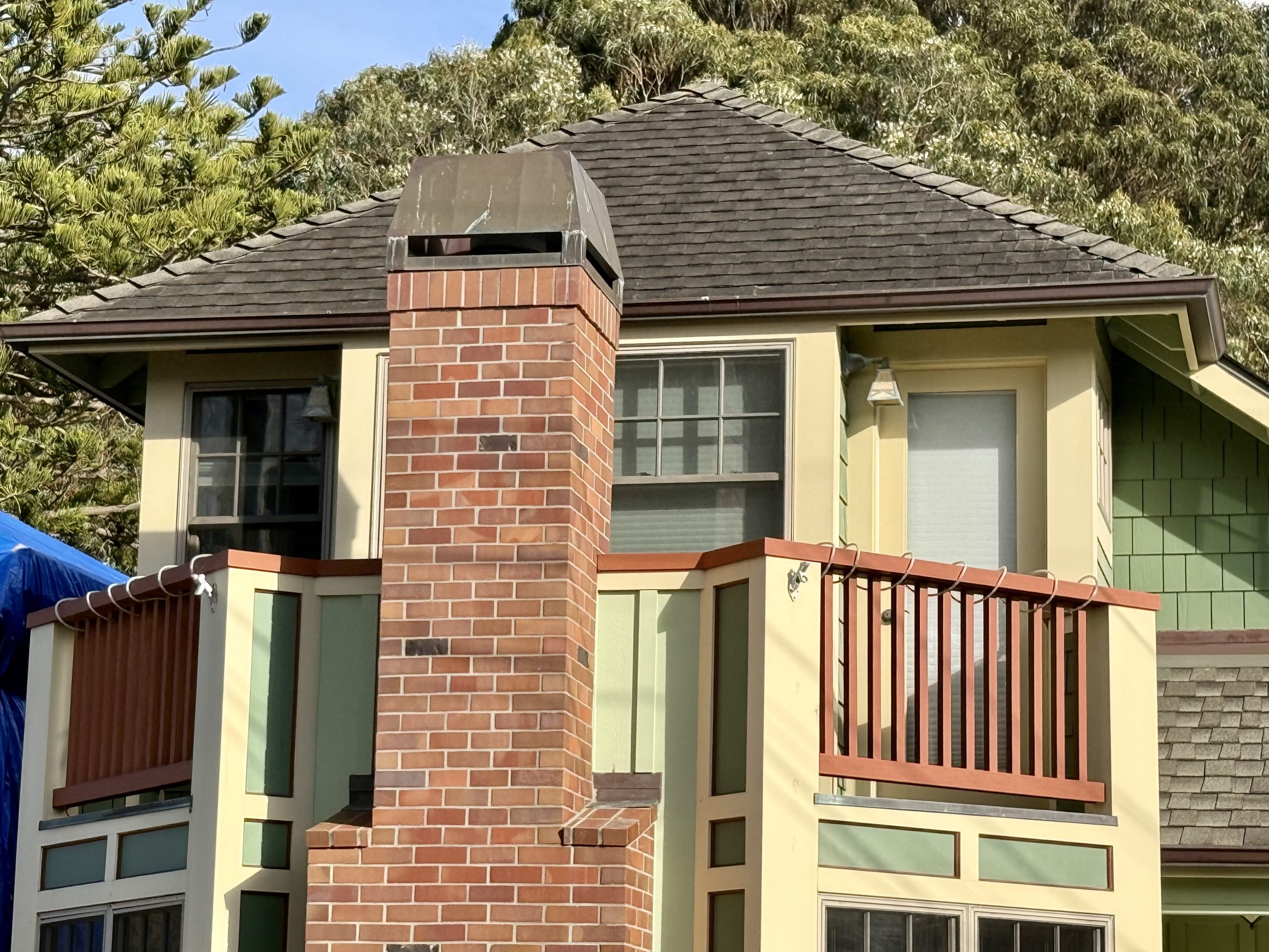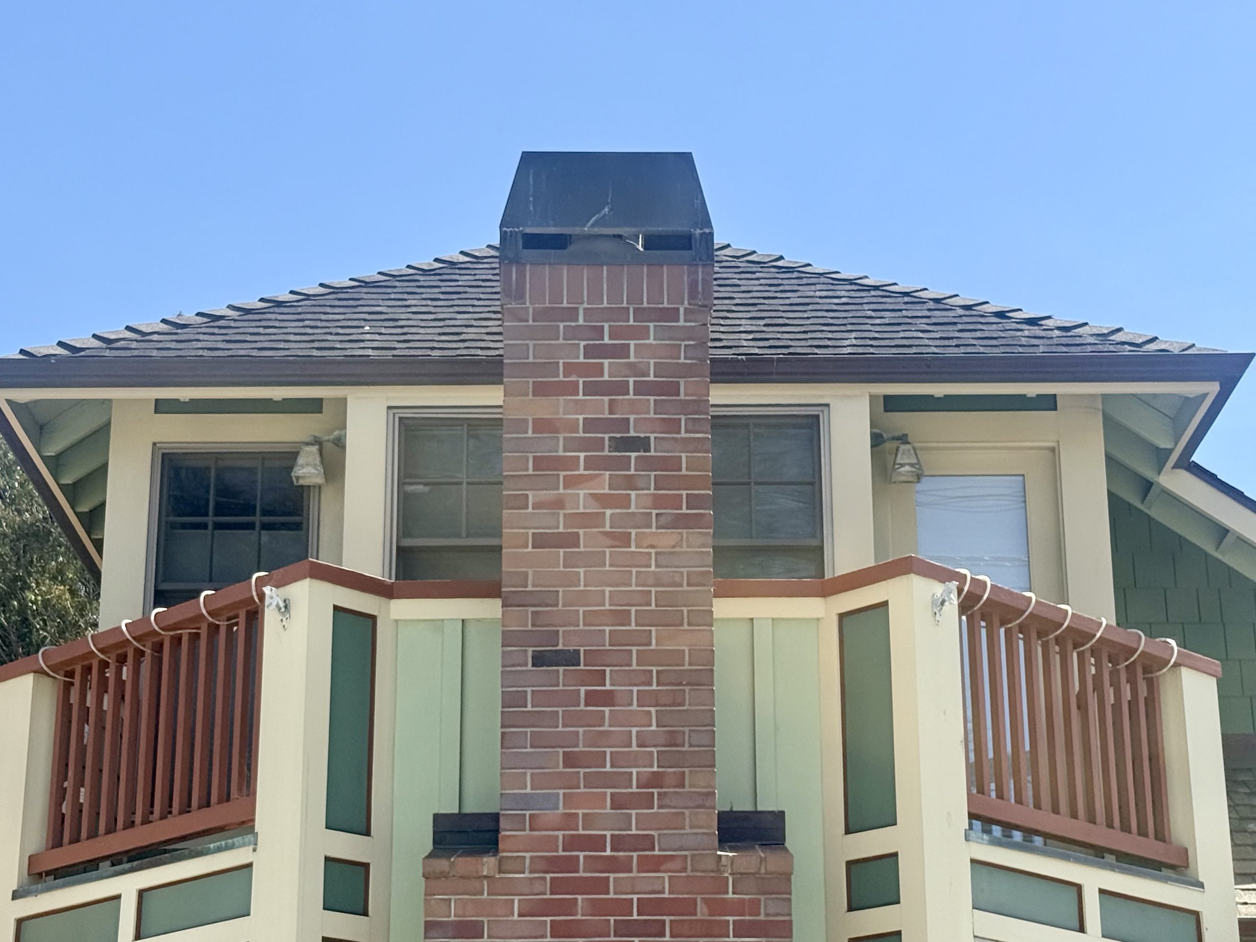 It wraps the brick chimney in new framing and adds shingled gable ends matching the green palette.